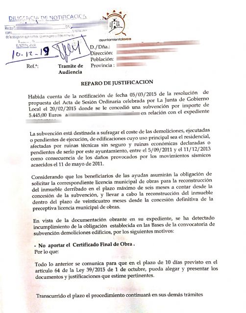 Se trata de un procedimiento tramitado por el Ayuntamiento de Lorca, a través de la oficina del terremoto, relacionado con una ayuda municipal para la demolición de viviendas que fueron declaradas en ruina y no contaban con cobertura aseguradora. El requerimiento un reparo de justificación ni siquiera contiene la rúbrica ni la firma electrónica de la trabajadora municipal que lo efectúa, lo que Martín calificó de "inadmisible" en una administración pública. "¿Cómo es posible que nuestro Ayuntamiento esté obligando a los ciudadanos a firmar papeles que no ofrecen ninguna garantía frente a una posterior alteración o manipulación de su contenido y que no identifican de manera inequívoca al firmante frente a una posible exigencia de responsabilidades como exige la Ley?", se preguntó Martín.