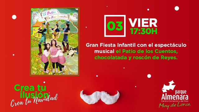 A partir del viernes 03 de Enero hasta el domingo 05, visitará el centro un Rey Mago, donde todos los niños podrán llevarse una foto con su rey y por el último, el viernes 03 de Enero viviremos una Gran Fiesta Infantil con el espectáculo “ El Patio de los Cuentos”, chocolatada y Roscón de Reyes y muchas sorpresas más a las 17:30h.