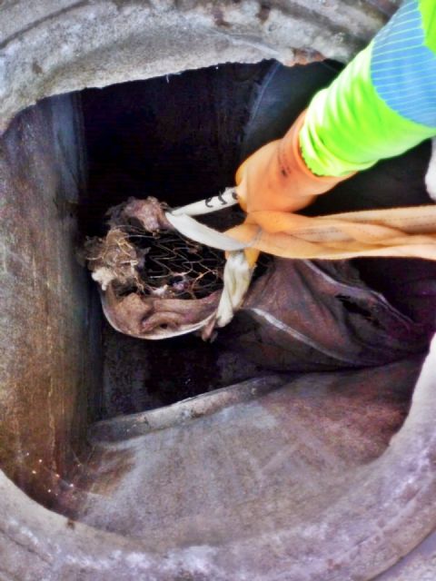 Si complicado debió ser introducirlo en el canal, nada fácil lo tuvieron los operarios de Aguas de Lorca para retirarlo de allí, ya que el colchón no se podía manipular, ni doblar, por lo que fue necesario engancharlo por una de las puntas y utilizar un camión pluma para extraerlo.