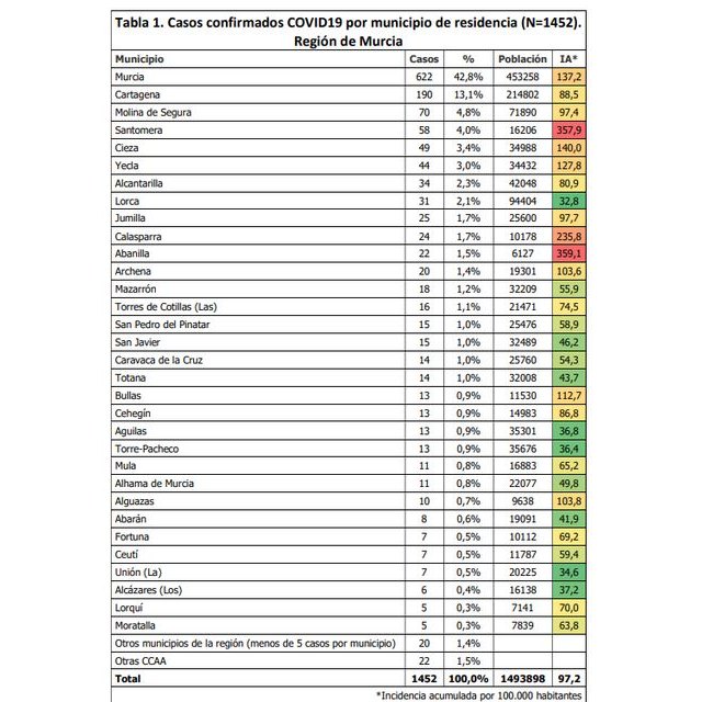 En la Región de Murcia hasta la fecha del informe se han registrado 1520 casos confirmados de infección por COVID-19. El primer caso se declaró el 6 de marzo y se confirmó como positivo el 8 de marzo.