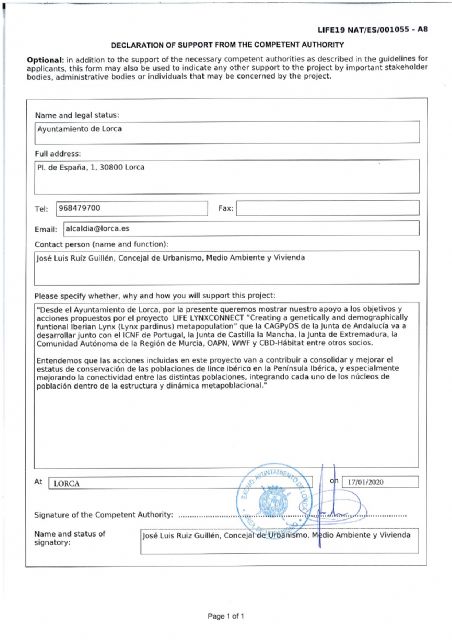 Ruiz Guillén ha explicado que desde el Consistorio lorquino entendemos que "este trabajo va a contribuir a consolidar y mejorar el estatus de conservación de las poblaciones de lince ibérico en la Península Ibérica, y especialmente mejorando la conectividad entre las distintas poblaciones de esta especie, integrando cada uno de los núcleos de población dentro de la estructura y dinámica metapoblacional".