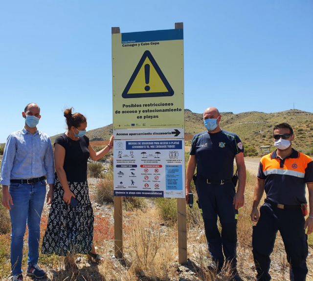Los concejales de Emergencias y Sanidad del Ayuntamiento de Lorca, Isabel Casalduero y José Ángel Ponce, han asistido a la colocación de los carteles informativos de las medidas de seguridad para prevenir el coronavirus en las playas de Puntas de Calnegre.