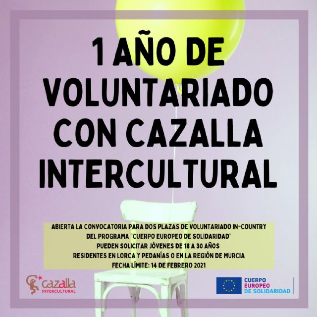 La asociación Cazalla Intercultural está buscando dos jóvenes entre 18 y 30 años que residan en Lorca y Pedanías o en la Región de Murcia, para un proyecto de 12 meses en Lorca. El proyecto consiste en la colaboración con la ONG Cazalla Intercultural y sus actividades educativas para jóvenes y el trabajo directo con jóvenes que viven en la ciudad. El proyecto trata de apoyar al equipo en la gestión de los proyectos, organizar y llevar a cabo actividades online, además de preparar y ofrecer actividades de ocio para estos jóvenes en el centro juvenil M13, una vez que nos aseguremos de que las medidas de seguridad para evitar la difusión de COVID-19 están todas establecidas. Perfil que estamos buscando: