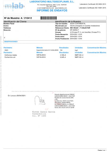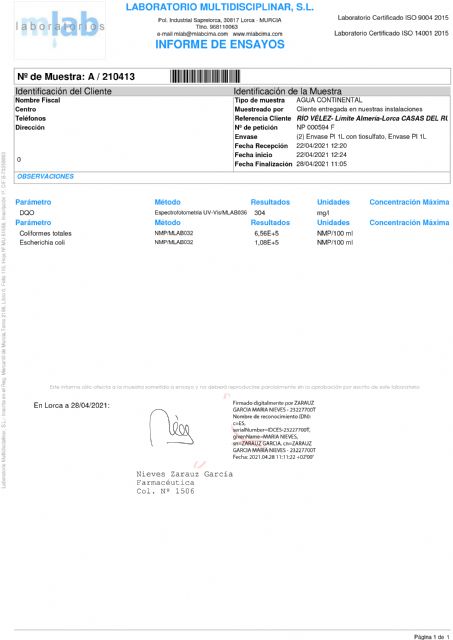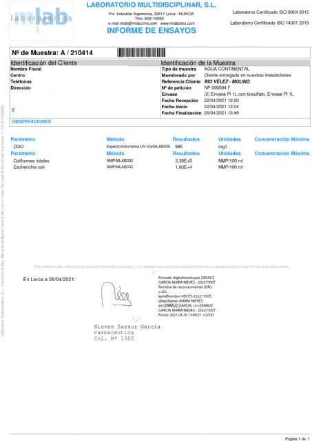 La muestra número 1 corresponde a la recogida en la rotura del colector en la rambla de Chirivel, a su paso por el casco urbano de Vélez Rubio (agua de color rosa); la número dos procede de un punto del río situado junto al antiguo molino harinero de Fontanares (agua de color negra); y la número tres fue tomada junto al último cortijo lorquino de esta pedanía antes de cruzar el límite con el municipio almeriense (agua de color gris).Los análisis muestran tres parámetros: la Demanda Química de Oxígeno (DQO), los coliformes totales y la incidencia de Escherichia coli (E. coli).