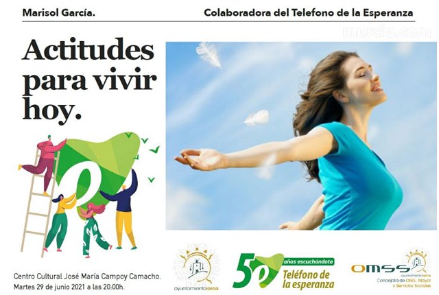 El próximo martes 29 de junio a las 20:00 horas tendrá lugar en el Centro Cultural "José María Campoy Camacho" de Lorca la conferencia "Actitudes Para Vivir Hoy", que será impartida por Marisol García, colaboradora del Teléfono de la Esperanza.