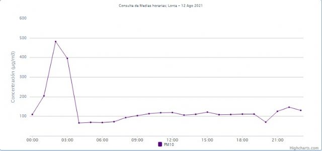 El concejal de Medio Ambiente ha detallado que "según los registros de contaminación de la web de calidad del aire de la Dirección General de Medio Ambiente de la Comunidad Autónoma (https://sinqlair.carm.es/calidadaire/) se alcanzó un valor de 136 µg/m3 en cuanto a las partículas PM10 en la estación medidora de Lorca, situándose en el Nivel 3 del Protocolo marco de actuación municipal en episodios ambientales de contaminación de PM10".