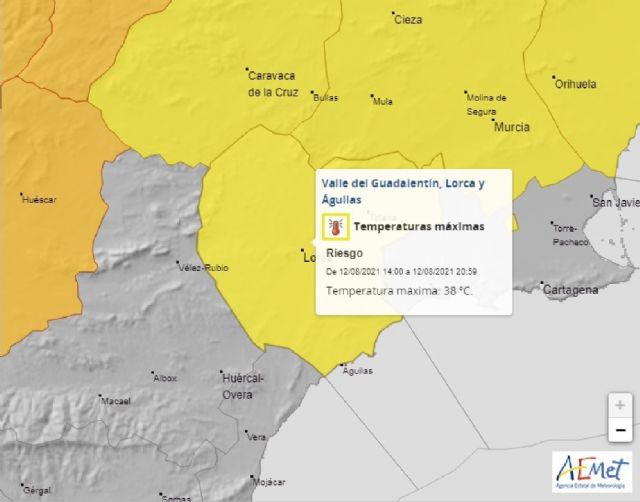 La edil ha detallado que "desde el viernes y hasta ayer lunes, 16 de agosto, ha permanecido activa esta alerta amarilla por altas temperaturas declarado por AEMET. La temperatura máxima alcanzada durante la ola de calor en Lorca fue el domingo cuando los termómetros llegaron a marcar los 43,8 grados".