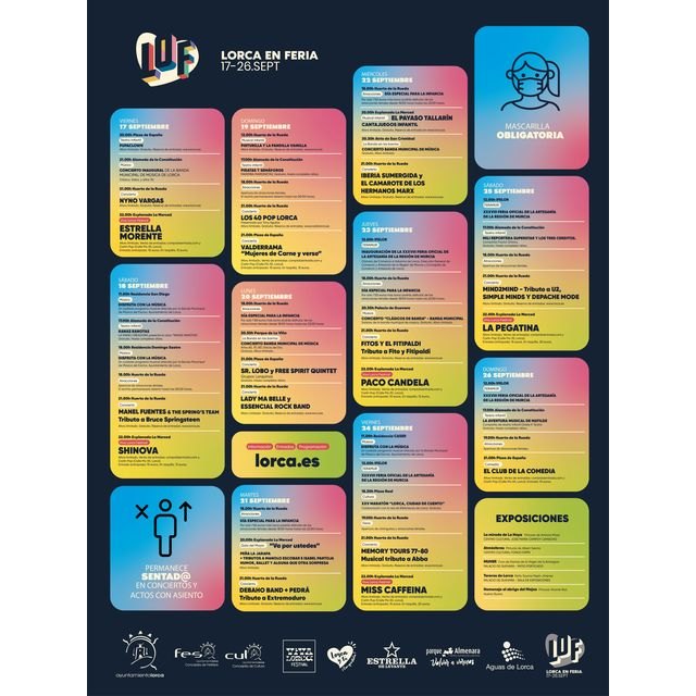 “En el Recinto Ferial del Huerto de la Rueda hemos diseñado un nuevo formato de feria. La entrada a la tradicional carpa será gratuita pero siempre con reserva previa y, por este escenario, pasarán artistas como el cantante Nyno Vargas y los tributos a Bruce Springsteen, liderado por el presentador de televisión Manel Fuentes, U2, Abba, Fito y Fitipaldis, así como el concierto Los 40 POP Lorca. Recordar, también, que la reserva de entradas para todos los conciertos gratuitos estará disponible a partir del próximo viernes, 10 de septiembre a las 12 horas, en la página web del Ayuntamiento de Lorca, www.lorca.es”.
