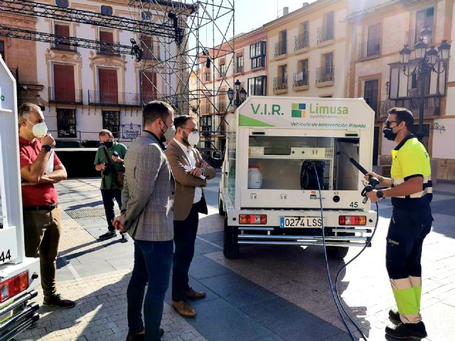 El alcalde de Lorca, Diego José Mateos, y el vicealcalde y concejal de Empresas Públicas, Francisco Morales, han presentado junto al director de Limusa, Francisco Ibáñez, dos nuevas hidrolimpiadoras y han informado de la ampliación del radio de fregado a calles angostas tras la adquisición de estos dos vehículos de menor tamaño.