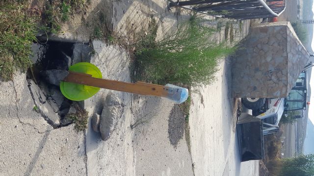 • A las densas nubes de mosquitos, residuos, basuras y excrementos, se suma ahora el hundimiento del camino que linda con el estanque, que ha sido señalizado clavando un palo de madera, la tapadera de un cubo de basura y una botella de plástico.