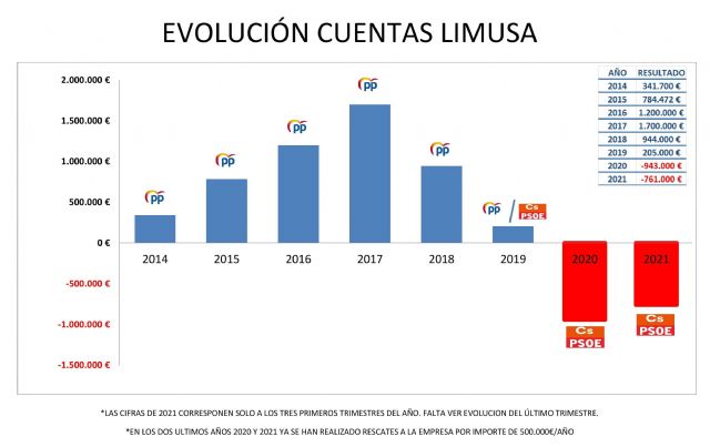 La empresa ha pasado de ofrecer superávit todos los años en los que fue gestionada por el Partido Popular a entrar en fuertes números rojos en cuanto el socialista Mateos la ha cogido. Así, con el PP Limusa obtuvo superávits de 341.700 € en 2014, 784.472 en 2015, 1,2 millones en 2016, 1,7 millones en 2017, 944.000 en 2018 y 205.200 en 2019. Estas cifras contrastan con el desastre que ha provocado el PSOE, con la friolera de más de 1,6 millones de euros de pérdidas acumuladas en los dos años que lleva en el gobierno, con pérdidas concretas de 943.000€ en 2020 y 761.000 entre los meses de enero y septiembre de 2021.
