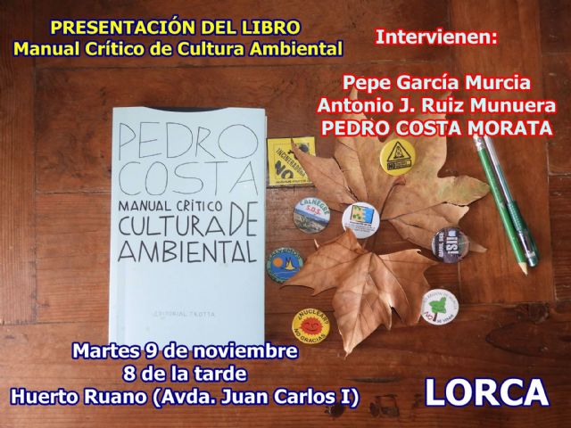 Pedro Costa Morata, ingeniero, sociólogo y periodista que fue galardonado con el Premio Nacional de Medio Ambiente en 1998, acompañado por el concejal portavoz de Izquierda Unida Verdes en Lorca, Pedro Sosa, ha anunciado ante los medios esta mañana el acto de presentación de su último libro "Manual Crítico de Cultura Ambiental". El acto se llevará a cabo mañana martes a las ocho de la tarde en el Huerto Ruano, junto al escritor lorquino Antonio J. Ruiz Munuera y el coordinador de la formación de IU-V Lorca, José García Murcia.