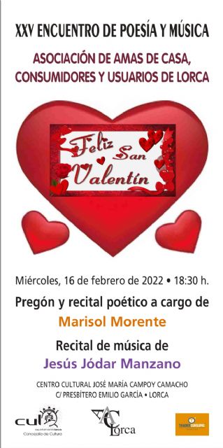 La concejala de Cultura, María Ángeles Mazuecos, ha detallado que "este evento contará con el pregón y el recital poético por parte de Marisol Morente, y una segunda parte con el recital musical de la mano de Jesús Jódar Manzano" y ha invitado "a todos los lorquinos y lorquinas a disfrutar de esta actividad cultural que se suma a las que poco a poco se van programando en nuestra ciudad".