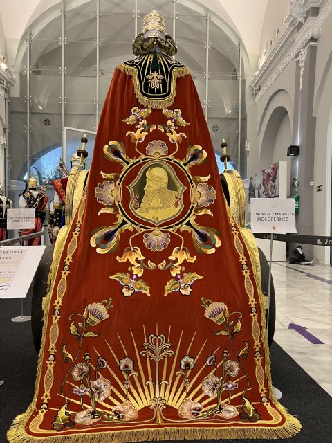 El personaje de la judía Judit porta un gran manto de 2,75 m de longitud por 1,75 m de anchura bordado en sedas, oro y pedrería sobre terciopelo de color lila. El perímetro del manto va ornado con una bella cenefa con flores bordadas en sedas rojas y rosadas que se insertan en los eslabones del cordón bordado en oro.