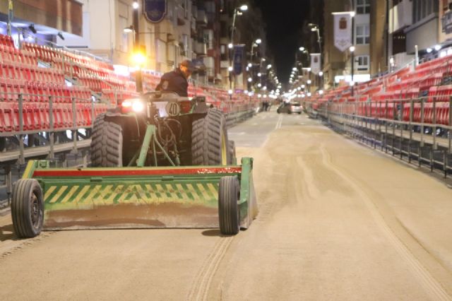 Mateos Molina ha detallado que "la imposición de la grava que cubre las vías asfaltadas para facilitar el paso de las caballerías se aplicó durante esta pasada madrugada de Viernes de Dolores y los trabajos han consistido en el tradicional enarenado sólo de la Avenida Juan Carlos I, desde Ovalo hasta la calle Floridablanca, llegando a pasar la longitud de fachada del palacete Huerto Ruano".
