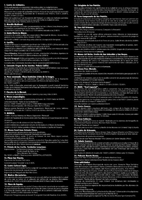 El vicealcalde y concejal de Turismo y Artesanía ha explicado que "a ellos se suman la programación de actividades en diferentes espacios turísticos y museísticos de Lorca como son el casco antiguo de Lorca; el Centro de Visitantes; el Castillo; la antigua Colegiata de San Patricio, a la que este año se suma la visita a su torre-campanario; el convento Virgen de las Huertas y el Palacio Califal; la Casa del Artesano; o el Museo del Belén".