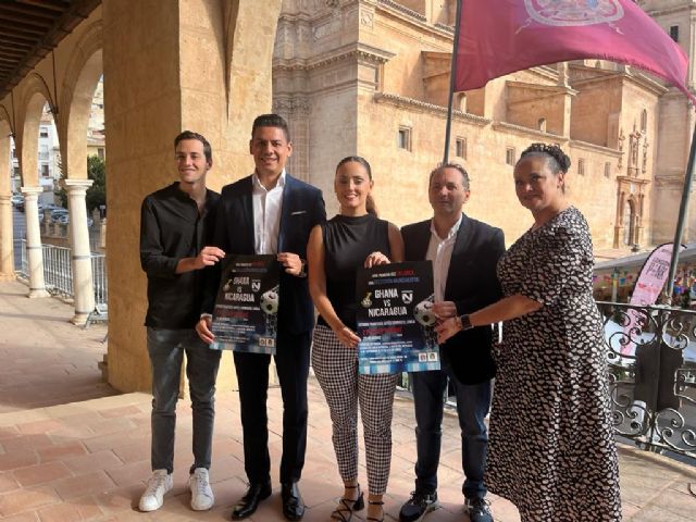La concejala de Deportes del Ayuntamiento de Lorca, Irene Jódar, ha presentado junto al miembro de la organización del evento, David Navarro, del Club de Fútbol Lorca Deportiva, el partido de fútbol amistoso entre las selecciones de Ghana y Nicaragua.