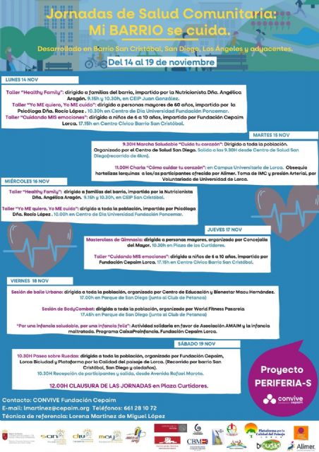 La representante de CEPAIM ha detallado que "el lunes, 14 de noviembre, la programación comienza con el taller 'Healthy Familiy' en el Colegio Juan González; seguido del taller 'Yo ME quiero, yo Me cuido', enfocado a la salud de las personas mayores de 60 años en el Centro de Día de Poncemar a las 10:30 horas, y por la tarde el taller infantil 'Cuidando mis emociones' en el Centro Cívico de San Cristóbal a las 17:15 horas. El martes 15 de noviembre, a las 9:30 horas y con inicio en el Centro de Salud de San Diego, tendrá lugar la Marcha Saludable 'Cuida tu corazón' y, a las 11:00 horas, la charla 'Cómo cuidar tu corazón' en el Campus Universitario de Lorca".