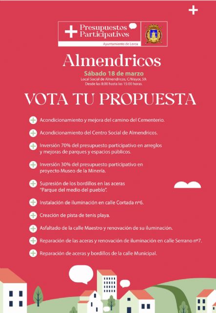 Actualmente y una vez finalizado el periodo de valoración de propuestas presentadas pasan a votación, por cumplir con todos los requisitos, legales, económicos y técnicos, 10 de las 24 propuestas presentadas. La votación se realizará este sábado, 18 de marzo, en el Centro Social de Almendricos de 8 a 15 horas, fecha acordada con la Asociación de Vecinos de la pedanía.