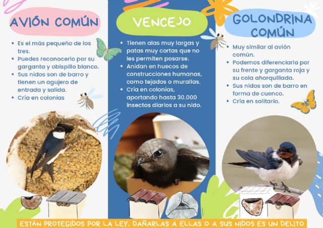 Ponce ha explicado que "la concejalía de Sanidad en colaboración con la asociación lorquina SOS Vencejos apuesta por la educación ambientalpara divulgar el conocimiento, aprecio y respeto a las aves y a la naturaleza en general, con la edición de un tríptico informativo sobre tres especies de aves migratorias que nos visitan todos los años: el avión común, el vencejo y la golondrina común".