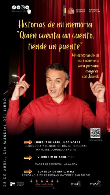 La concejala de Educación ha explicado que "dentro de la programación con motivo del Día Mundial del Libro, el 23 de abril, se ha organizado un espectáculo de narración oral de la mano del personaje Juanolo, destinado a personas mayores, bajo el titulo de Historias de mi memoria 'Quien cuenta un cuento tiene un puente'.