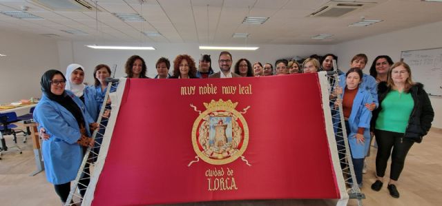 El alcalde de Lorca, Diego José Mateos, ha sido el encargado de dar la última puntada de una bandera que ha sido realizada por 13 alumnas y 2 monitoras del programa 'Proempleo 22/23'.