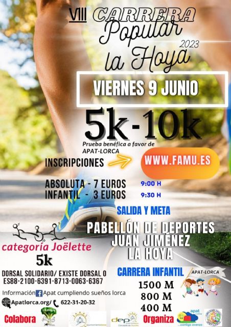 La Asociación de Padres y Madres de Atención Temprana de Lorca y la Asociación de Vecinos de La Hoya, organizan la VIII Carrera Popular de La Hoya en colaboración con la Concejalía de Deportes del Excmo. Ayuntamiento de Lorca y la FAMU