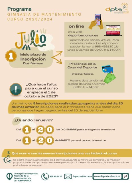 Los cursos de gimnasia de mantenimiento darán comienzo el 1 de octubre siempre y cuando se hayan realizado un mínimo de ocho inscripciones el día 20 del mes anterior, en este caso el 20 de septiembre. Este criterio se mantendrá el resto de trimestres. En el caso de nuevas inscripciones una vez comenzado el curso, las personas solicitantes podrán iniciar la actividad el día 1 del mes, pagando la matrícula completa y la fracción proporcional el tiempo restante de ese periodo (1 o 2 meses). En este caso, la inscripción solo se podrá hacer presencial. Los procesos de renovación se llevarán a cabo del 1 al 20 de diciembre (para el 2° trimestre) y del 1 al 20 de marzo (para el 3° trimestre).