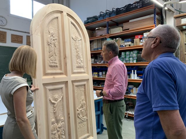 La rehabilitación de este espacio de recogimiento se completará con la construcción de dos reclinatorios que se colocarán delante del altar que será 'vestido' convenientemente. El alcalde, Fulgencio Gil Jódar, visitaba los talleres de Empleo y contemplaba la puerta recién terminada de tallar. "Es impresionante. Todavía está pendientes de barnizar, lo que la dotará de un color miel que se matizará una vez sea encerada, como nos explicaban los técnicos. Las pretensiones son que pueda colocarse después del verano, en la recta final de las obras".