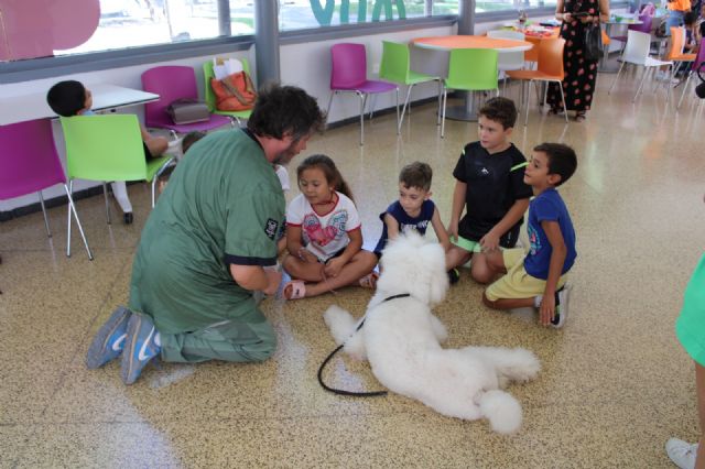 Los menores que presentan necesidades especiales que participan estos días en los talleres de conciliación en la antigua estación del ferrocarril de Sutullena disfrutaban de una nueva experiencia. Se trata de una terapia con perros que ofrecía un responsable, Juan Miguel Marín Fernández, del Centro Canino de Lorca. "Entre sus propósitos está promover una mejoría en estos pequeños tanto a nivel físico como emocional, social y cognitivo", explicaba este viernes la edil de Familia, María de las Huertas García Pérez.