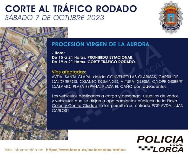 Policía Local establecerá normas especiales de circulación para el tráfico rodado de vehículos mañana sábado, 7 de octubre, por la procesión de la Virgen de la Aurora, con motivo de su festividad. La misma partirá desde el Convento de Las Clarisas hasta San Patricio y en ella participarán la Cuadrilla de los Auroros de Lorca; la Banda Municipal de Música; Coros y Danzas de Lorca y Coros y Danzas Virgen de las Huertas; así como otras cuadrillas de distintos puntos de España, cofradías y hermandades de nuestra ciudad.