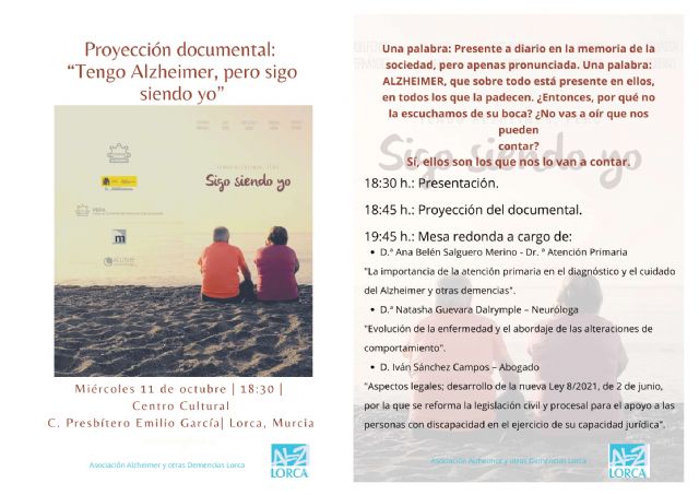 La Asociación Alzheimer y otras Demencias Lorca presenta el próximo el miércoles 11 de octubre de 2023, en el Centro Cultural de Lorca, el documental 'Tengo Alzheimer, pero sigo siendo yo', una pieza audiovisual que muestra el impacto de la comunicación del diagnóstico en los pacientes, pero también cómo cambia su vida, sus miedos, desafíos y luchan día a día contra la enfermedad.