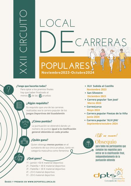 El circuito local de carreras populares llega este año con una novedad importante y es que, según ha explicado el concejal de Deportes, "todas aquellas personas que cumplan los requisitos para entrar en la clasificación final, que se decide en la carrera popular de los Juegos Deportivos del Guadalentín, recibirán un obsequio independientemente de la clasificación que hayan obtenido. De esta forma, reconocemos la fidelidad de muchos atletas lorquinos que son fieles a nuestras carreras populares pero que no suelen optar a los tres primeros premios por las marcas que obtienen.