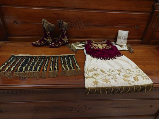 El traje, que lleva los atributos del emperador Antíoco, ha sido donada por Dª. María Jesús García Periago y desfiló en el cortejo del Paso Blanco, el Viernes Santo de 1891.