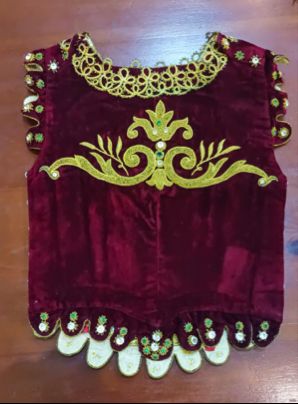 Chaleco desmangado, realizado en terciopelo rojo y bordado con canutillo de oro y adornos de pedrería: En la parte delantera está bordada un águila bicéfala cuyas patas sujetan finos tallos vegetales, posiblemente de olivo. En la parte trasera lleva bordado en seda con pedrería un candelabro vegetal del que parten dos tallos curvados y una fina rama de olivo.