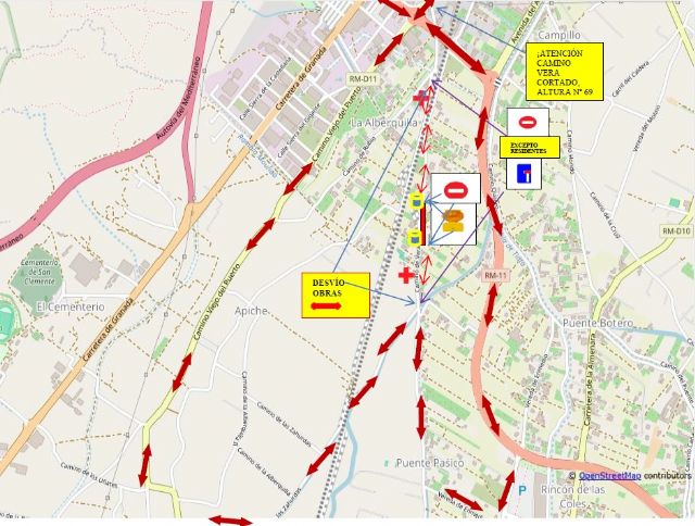 Para los procedentes de RM-D11 con sentido Centro Comercial Almenara, Camino Viejo del Puerto, Camino Real de Vera, el itinerario alternativo paso por Ronda Sur- RM-D11, Centro Comercial Almenara, Camino de En medio, con reincorporación a Camino Real de Vera, Puente Pasico, Camino Zahurdas, Ctra. La Estación, RM-D11 o viceversa sentido centro ciudad.