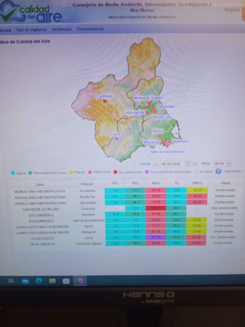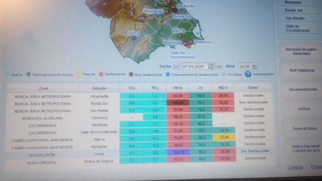 Lorca.8/04/2024. Hay seis categorías que miden la calidad del aire (buena, razonablemente buena, regular, desfavorable, muy desfavorable y extremadamente desfavorable). Lorca lleva desde ayer, al superar los 150 microgramos de PM10 (partículas en suspensión) por metro cúbico, inmersa en un prolongado episodio de calidad del aire "extremadamente desfavorable". Según aparece en la web del gobierno regional donde se registran datos en tiempo de real de todas las estaciones de vigilancia de la calidad del aire, la estación de Lorca es la que registra a estas horas y desde ayer los peores datos de toda la Región: 157, 5 microgramos de PM10 por m3. Cabe advertir que el valor límite establecido no puede superar los 50 microgramos, y ese dato implica más que triplicarlo.
