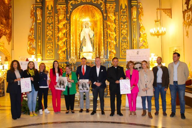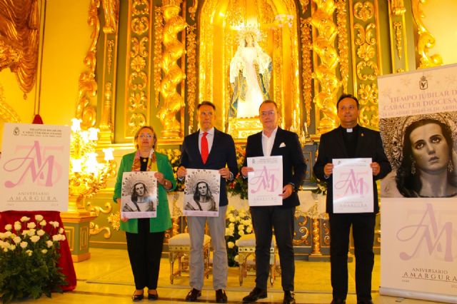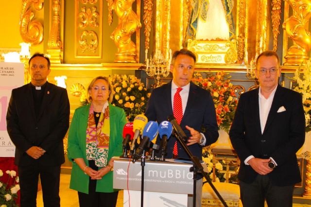 Lo hacía en la Capilla del Rosario, sede religiosa del Paso Blanco, donde junto al presidente de la cofradía, Ramón Mateos; la presidenta del Coro de Damas de la Virgen de la Amargura, María Jesús Pérez Periago; y el consiliario del Paso Blanco, José Manuel Martínez Rosique, presentaban el Tiempo Jubilar para celebrar el 75 aniversario de la llegada de la imagen a Lorca.