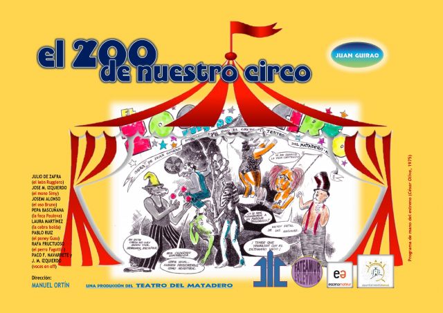 El 'Zoo de nuestro circo' constituye la segunda obra escénica de Juan Guirao. Fue escrita bajo demanda y estrenada en 1975 a petición del grupo de teatro infantil 'La Tartana', justo cuando empezó a conocer los secretos del escenario, seis años después de ver la luz 'Farsa de la molinera y el corregidor'.