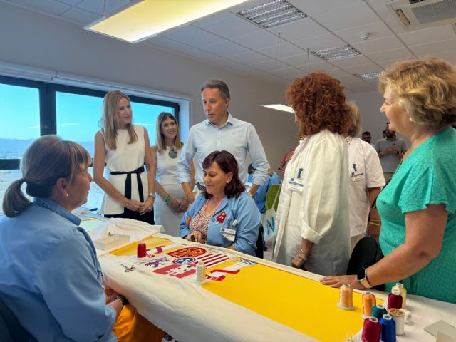 Durante su visita, Fulgencio Gil y Marisa Aragón han dado la última puntada del bordado de la bandera de Región de Murcia; un proyecto que realizan las once alumnas que participan, desde el pasado mes de marzo, en los talleres municipales de bordados en seda y oro que forman parte del proyecto "Activa-T"; un programa de formación, empleo e inserción financiado por el Ayuntamiento de Lorca. "Esta acción refleja el compromiso del Consistorio con el bordado y con nuestras bordadoras, sin cuya aportación y esfuerzo no sería posible que nuestra Semana Santa hubiera alcanzado la categoría y relevancia internacional con la que hoy contamos", ha reseñado Gil Jódar.