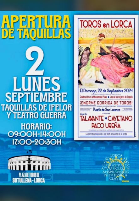 A partir de este lunes, 2 de septiembre, se ponen a la venta las entradas de la corrida de toros que tendrá lugar en el Coso de Sutullena el próximo 22 de septiembre, a las 18:00 horas, teniendo como protagonistas a los espadas Alejandro Talavante, Cayetano Rivera Ordoñez y Paco Ureña, con toros de la ganadería Puerto de San Lorenzo.
