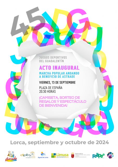 La cuadragésima quinta edición de los Juegos Deportivos del Guadalentín arrancará el próximo viernes 13 de septiembre con la tradicional marcha inaugural andando que partirá a las 20.30 horas desde la Plaza de España con un recorrido de 5.500 metros de distancia por las principales avenidas y calles de la ciudad. Con esta actividad multitunidaria y el acto de inauguración posterior se dará el pistoletazo de salida al calendario de eventos de este año que se prolongará hasta el próximo 20 de octubre. Como en ediciones anteriores, la marcha popular será solidaria, este año a beneficio de la Asociación para la Atención de Personas con Trastornos Generalizados del Desarrollo de la Región de Murcia (ASTRADE). Para facilitar el acceso en las mejores condiciones, se habilitarán cuatro zonas de inscripción por las calles Selgas, Cava, Álamo y Santiago. Las inscripciones se podrán realizar a partir de las 19.30 horas y todas las personas inscritas recibirán la camiseta conmemorativa de este año con un llamativo diseño de color verde fluor siguiendo los parámetros iconográficos del cartel. Los técnicos del complejo deportivo Felipe VI animará la espera antes del inicio de la marcha que concluirá con una actuación musical en meta y la ceremonia de apertura en la que no faltará el sorteo de regalos entre todos los inscritos y el encendido de la antorcha de las conocidas como 'olimpiadas lorquinas'.