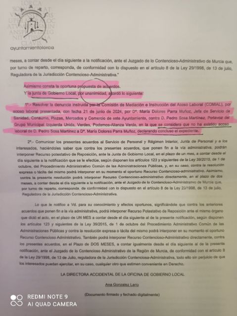 En su pregunta, Sosa transcribe el acta de la Junta de Gobierno Local de fecha 19 de julio de 2024 en la que, entre otros extremos, se da cuenta de una "Moción de la concejal de Recursos Humanos sobre escrito de denuncia por acoso laboral" en la que textualmente se afirma que esa Junta de Gobierno Local, POR UNANIMIDAD, acordó "… resolver la denuncia instruida por la Comisión de Mediación e Instrucción del Acoso Laboral … contra D. Pedro Sosa Martínez… en la que se considera que NO HA EXISTIDO ACOSO LABORAL DE DON PEDRO SOSA MARTÍNEZ…, DECLARANDO CONCLUSO EL EXPEDIENTE".