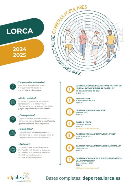 Las siete pruebas incluidas en el Circuito son: el Cross Patrón de Lorca, la San Silvestre del próximo mes de diciembre, la carrera popular de San José en marzo, el 'CorrexLorca' en mayo, la carrera popular 'Fiestas de La Viña' en junio, la carrera popular de Campillo en agosto y la carrera popular de los XLVI Juegos Deportivos del Guadalentín (JDG).