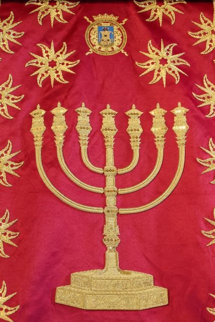 Flanquean la pieza dos bandas que se enriquecen con los siete versículos, seis de ellos en oro, que conforman el Shemá Israel, la principal oración judía que exalta la unicidad de Dios. Siguiendo los preceptos del judaísmo, el segundo versículo ha sido bordado en plata, pues este ha de rezarse a sottovoce. Cierran la obra sendas bandas de tisú de plata bordadas en oro con tracerías góticas inspiradas, igualmente, en la decoración original de la sinagoga lorquina.