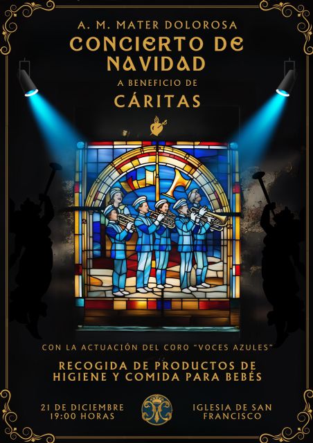 El sábado, 21 de diciembre tendrá lugar el tradicional Concierto Solidario de Navidad de la Agrupación Musical Mater Dolorosa, a las 19 horas en San Francisco, con la participación del nuevo coro del Paso Azul, Voces Azules, en la que será su primera actuación pública. A la entrada del concierto, se recogerán productos de higiene y alimentación infantiles a beneficio de Cáritas.