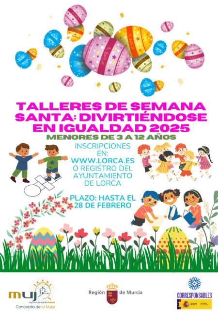 La concejalía de Mujer abre el plazo para presentar la solicitud de participación en los talleres de Semana Santa "Divirtiéndose en Igualdad", una iniciativa dirigida a las familias lorquinas que ofrece 330 plazas con el objetivo de brindar servicios de corresponsabilidad y atención a niños y niñas durante este periodo, reflejando el firme compromiso del Gobierno de Lorca con la conciliación.