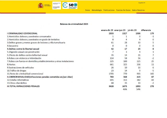 El concejal socialista también ha destacado que en el primer semestre de 2023, bajo el gobierno de Diego José Mateos, se registraron 1.675 infracciones penales, mientras que en el segundo semestre, ya con Fulgencio Gil como alcalde, la cifra ascendió a 1.953, lo que supone una subida de 14,3% respecto al primer semestre. "Estos son los datos reales y contrastables. La criminalidad convencional ha crecido en más de 100 delitos en la calle, mientras que la cibercriminalidad ha disminuido", ha subrayado.