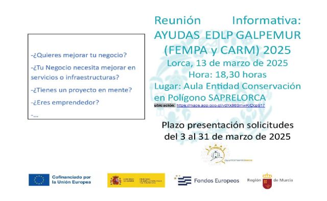 El edil de Agricultura y Ganadería del Ayuntamiento de Lorca, Ángel Meca, ha informado sobre la reunión informativa presencial para todos los interesados en la convocatoria de ayudas públicas para proyectos dentro la estrategia de desarrollo local participativo (EDLP) del Grupo de Acción Local de Pesca y Acuicultura de la Región de Murcia (GALPEMUR), en el Marco del Programa del Fondo Europeo Marítimo, de Pesca y de Acuicultura (FEMPA), que será el próximo jueves, 13 de marzo, a las 18:30 horas, en el Aula de Entidad de Conservación, en el polígono Saprelorca.