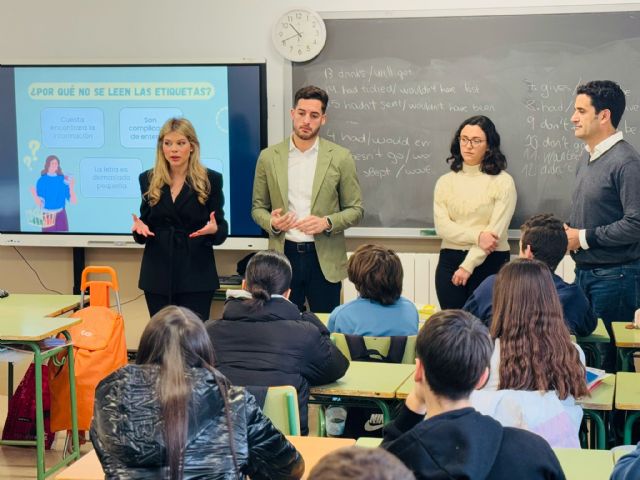 La concejal de concejal de Consumo, Belén Díaz Arcas, acompañada del director general de Consumo de la Región de Murcia, Alberto Sánchez Campillo, ha visitado en la mañana de este jueves los talleres llevados a cabo en el instituto Francisco Ros Giner, donde casi un centenar de alumnos de 1° de educación secundaria han tenido la oportunidad de participar en esta iniciativa para aprender a interpretar el etiquetado de productos que utilizamos en el día a día.